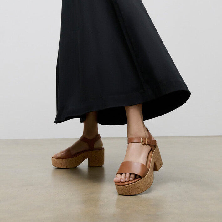 Đôi sandal tuyệt đẹp này có thiết kế gót cắt (tạo cảm giác thập niên 70), dây đai cổ chân điều chỉnh, và các đường nét gọn gàng tôn lên những đường cong của đôi giày. Phần trên được làm từ da cao cấp với sắc thái đậm, kết hợp với đế bọc vỏ cây tạo cảm giác mùa hè. Khóa kim loại chải bóng và lớp lót da tạo điểm nhấn tinh tế. Trên đế giữa CushX™ được thiết kế bởi chuyên gia sinh học, mang lại cảm giác như giày sneaker trong kiểu giày cao gót (bạn có thể đi cả ngày mà không mỏi).